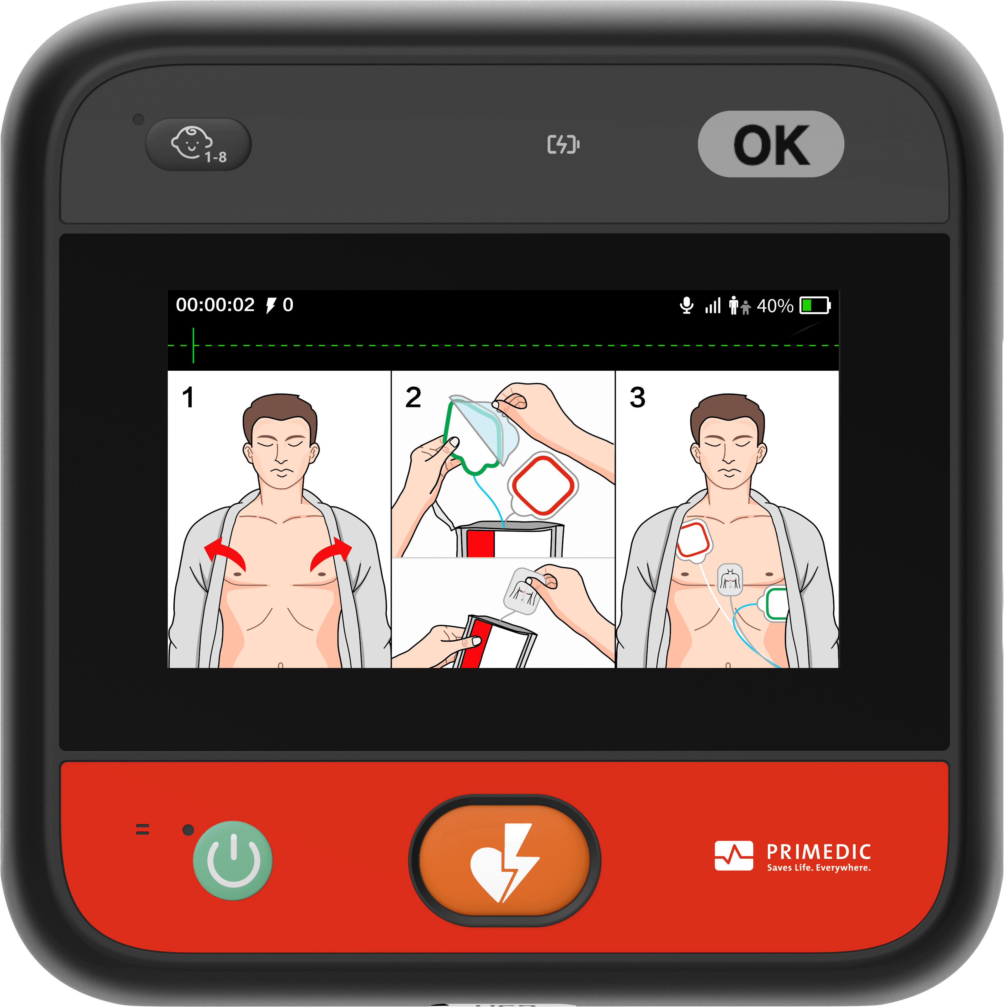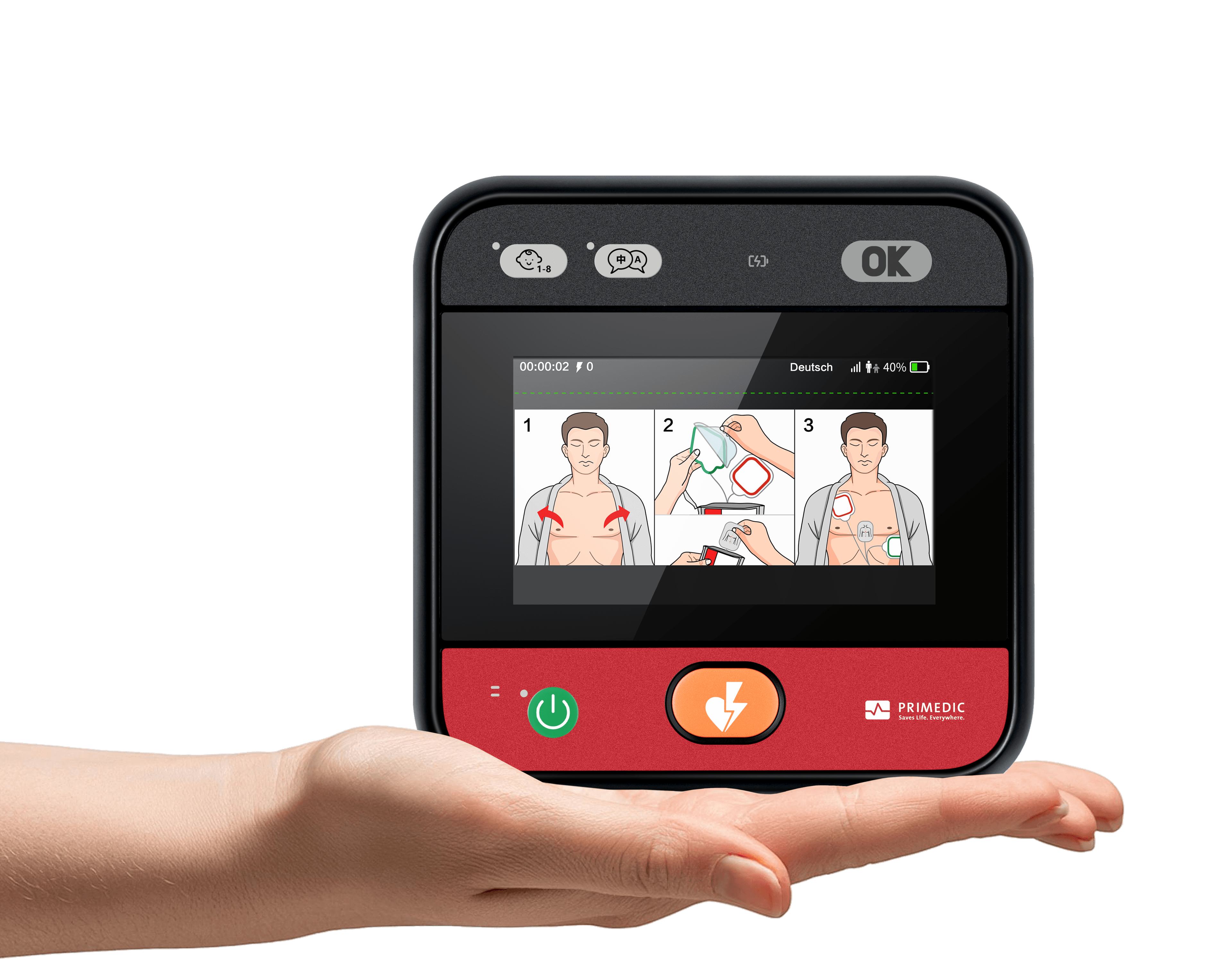 MyPAD Standard är vår modell med LCD skärm för extra hjälp(tydliga och animerade instruktioner, antal stötar, batteristatus). Extra hjälp när varje minut räknas.