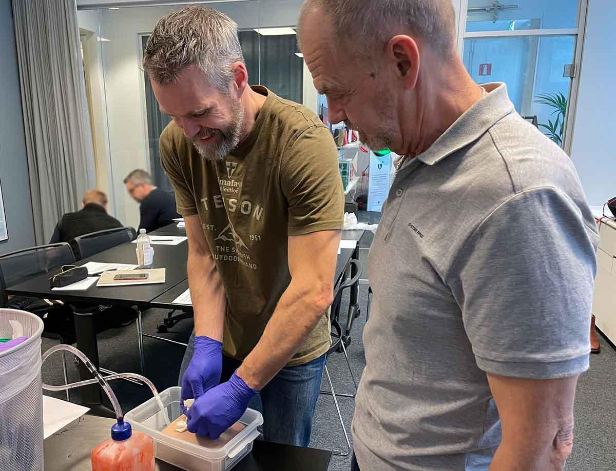 Utbildningen inkluderar både grundläggande första hjälpen vid blödningar och praktisk träning med tourniqueter (avsnörande förband) och sårskademoduler.